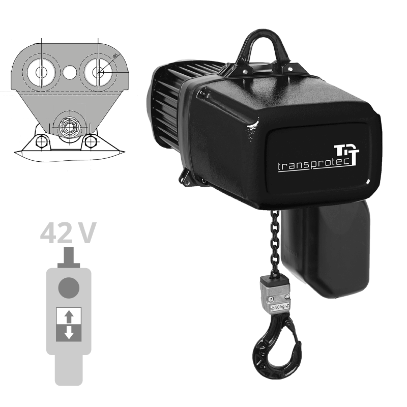Dieser Typ Elektrokettenzug ist im Standard mit einer 42 Volt Schützsteuerung, einem 3 m Hub und einem Metallgehäuse ausgestattet. Wahlweise kann dieser Kettenzug mit Elektro- oder Rollfahrwerk geliefert werden. Des Weiteren besteht die Wahl zwischen einer Ösen- und Hakenaufhängung. Werden mehr als 3 m Kette oder ein Sonder-Elektrokettenzug z.B. für den Ex-Bereich oder die Bühnentechnik benötigt, so stehen Ihnen unsere Fachberater gern für ein persönliches Beratungsgespräch unter 04102 7789-600 oder per Mail info@transprotec.de zur Verfügung.