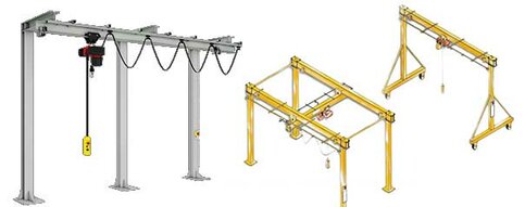 Bockkrane aus Aluminium sind flexibel einsetzbare Leichtgewichte zur Bewegung von Traglasten bis 5.000 kg, die schwereren, aber dafür robusteren Stahl-Bockkrane heben noch größere Lasten tragen.