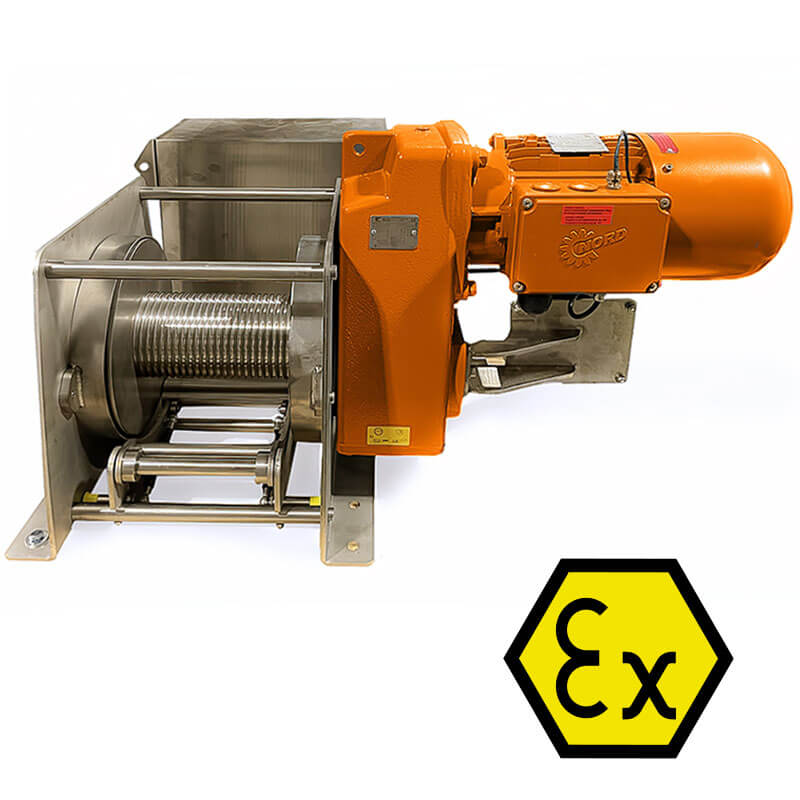 Die Seilwinde verfügt über eine Vielzahl von Schutzmechanismen, die das Risiko von Funkenbildung und somit potenziellen Entzündungen in Umgebungen mit brennbaren Gemischen aus Luft, Gasen oder Stäuben drastisch reduzieren.